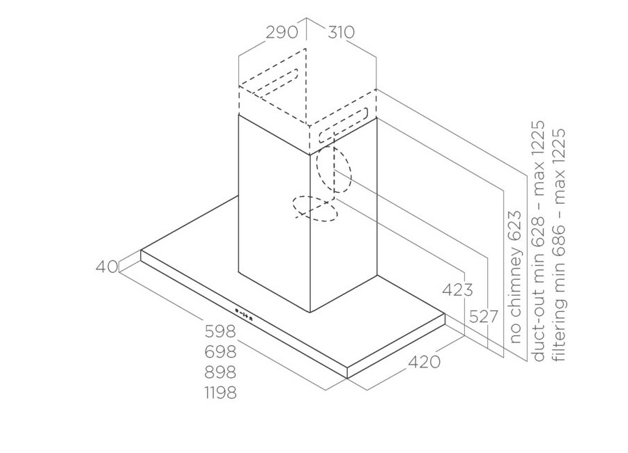 - Возможность установки, в вытяжной или фильтрующей версии, без верхнего дымохода, при условии нахождения на высоте 680 мм