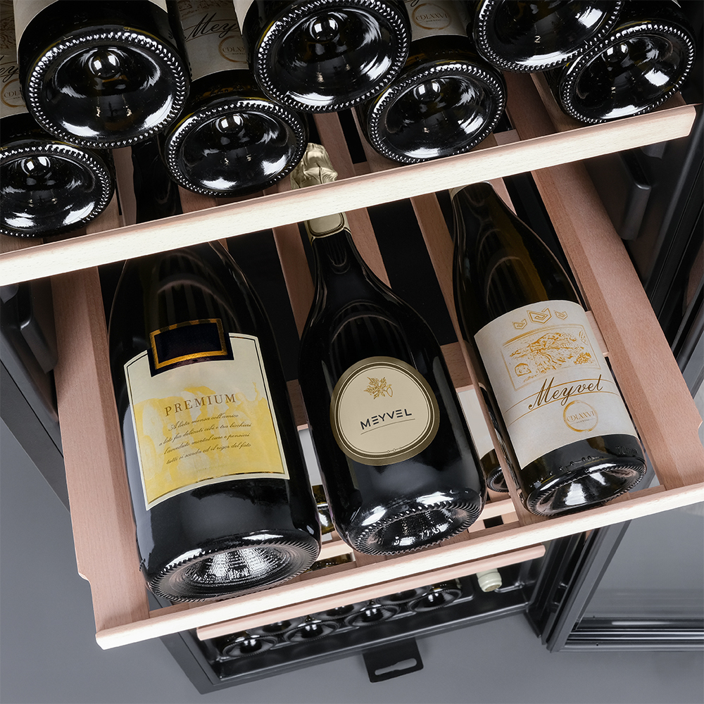 Модель оснащена пятью полками из дерева, что не только выглядит стильно, но и способствует правильной циркуляции воздуха внутри шкафа. Дополнительно можно установить до 8 полок, а также приобрести демонстрационную полку и полку для фужеров. Тройное стекло с УФ-фильтром надежно защищает вино от вредного воздействия света, что сохраняет его уникальный вкус и аромат.